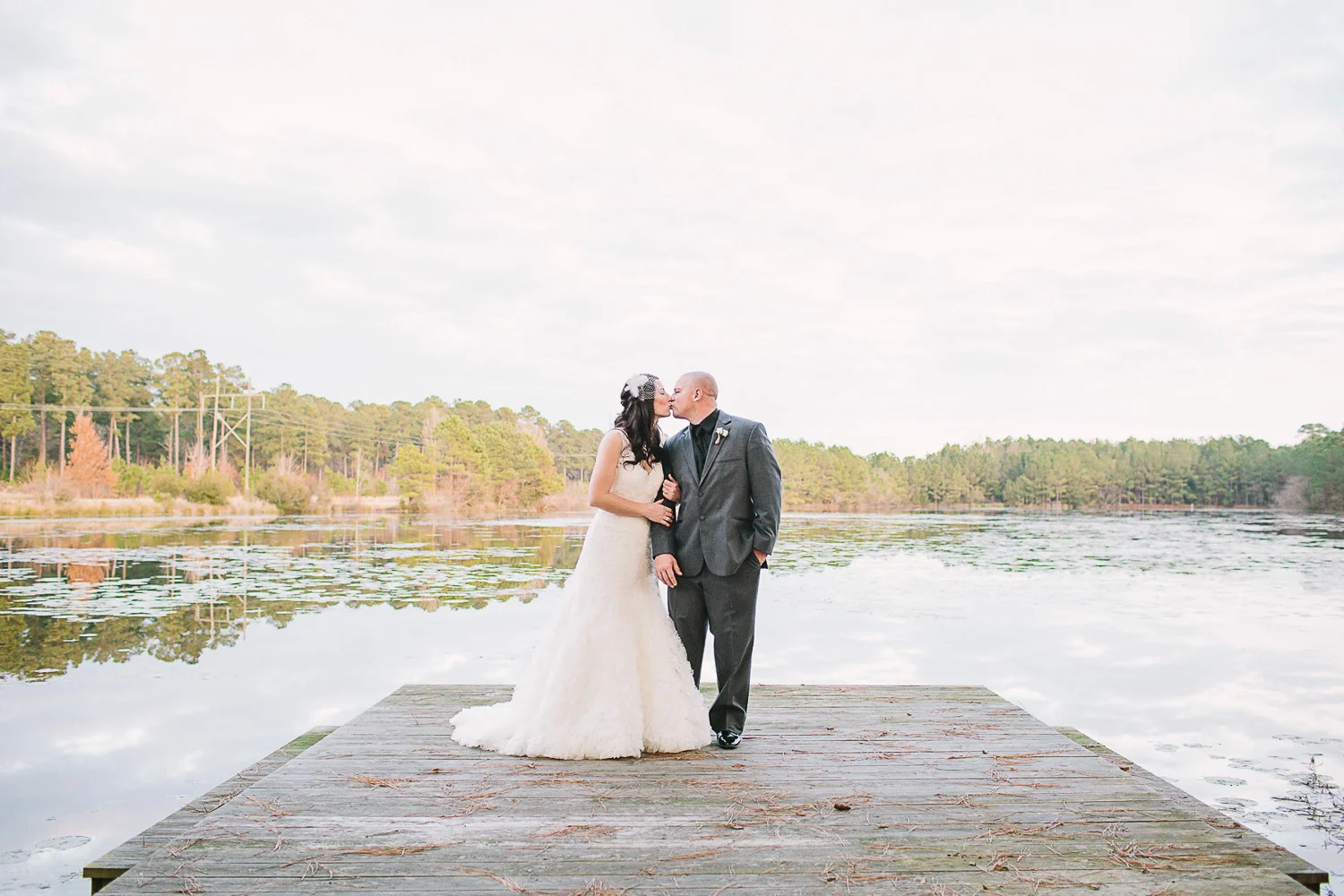 Beth and John celebrated the amazing wedding day at the beautiful Lake House at Bulow on Johns Island. The unseasonably warm day was full of beautiful sunshine and excited family and friends. The gorgeous ceremony site was set on the island in the lake, beneath a grove of pine trees. I loved the ceremony backdrop, two rustic old doors that Beth and John found themselves. Soft florals with hints of pink and peach added a feminine touch to the rustic cabin at the lake. Candle lit lanterns only added to the twilight as guests of all ages enjoyed dancing under the moonlit sky.